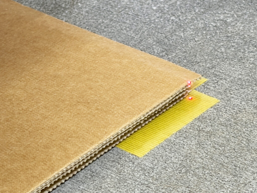 上は、コングスバーグの始点(赤いレーザー)をダンボールの角に合わせているところです。UFOキャッチャーみたい。