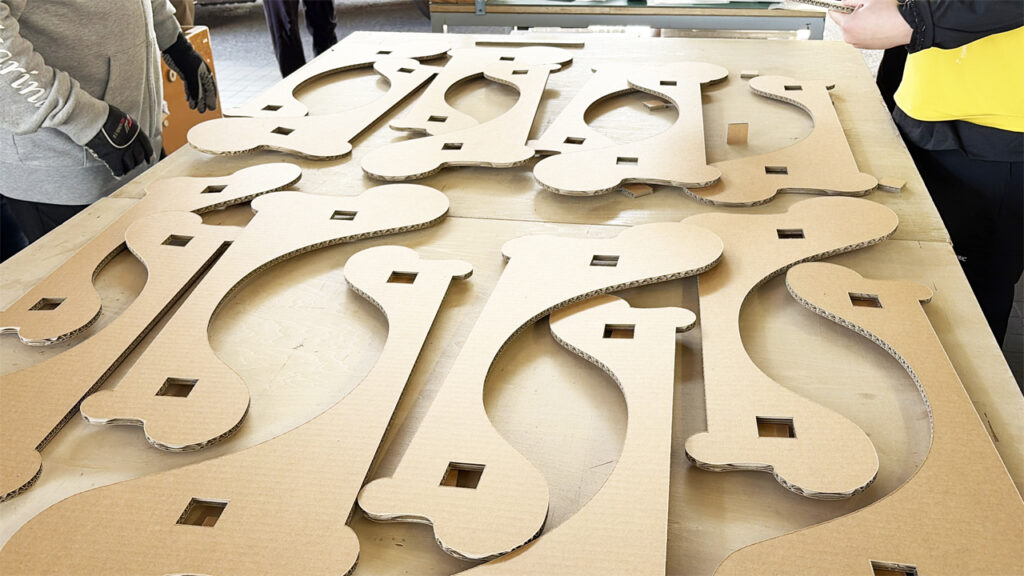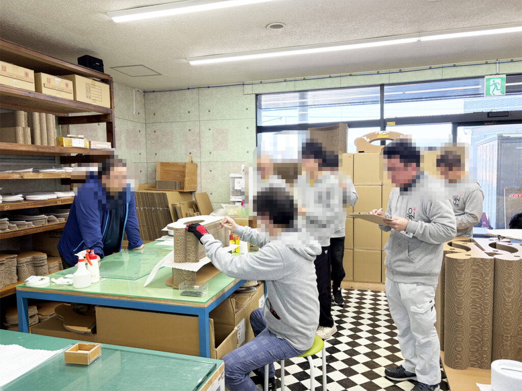 就労継続支援A型OPENでは、おしゃれな猫の爪とぎ家具「カリカリーナ」の制作を請け負っていますが、いつもは製造固定ごとのグループに分かれて作業をしています。